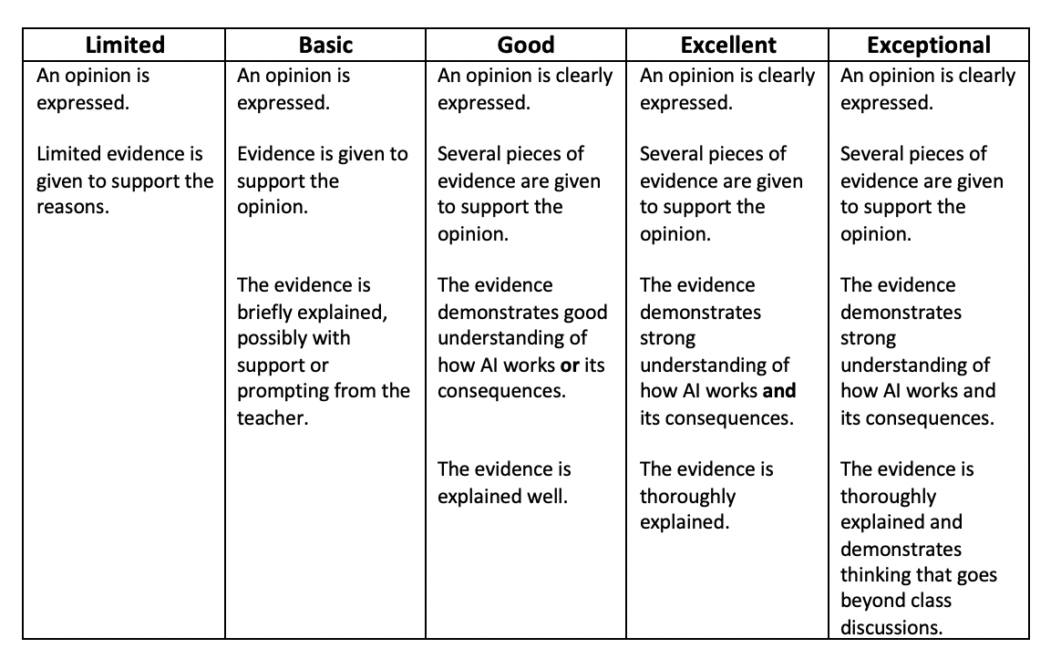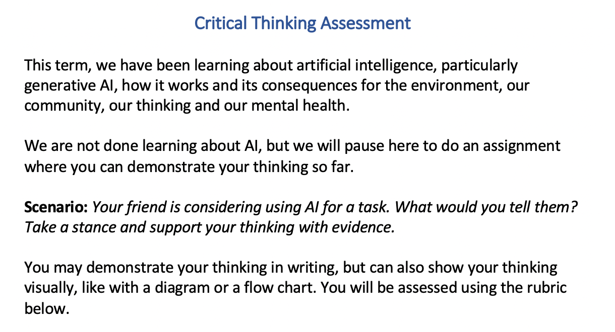 When I ask students to give their friend advice about AI, I kept the scenario purposely vague. I wanted students to think about situations that are relevant for them and more clearly defining the task their friend wants to accomplish might limit my students' thinking. A lot of students ended up deciding that the appropriateness of AI depends on the given situation and spent time outlining when they would find it acceptable and when they would advise against it. This type of decision-making, particularly when supported by reasoning and evidence, is what I was hoping to see. Students' opinions didn't always match my own, but that was never the point. I wanted them to make well-reasoned decisions regarding AI, using a solid understanding of how AI works, its capabilities and its drawbacks.